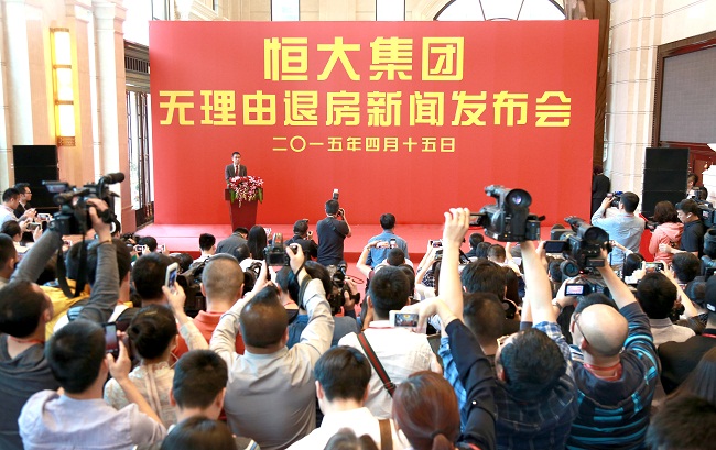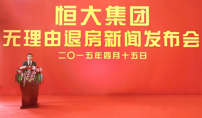 4月15日,恒大集团在广州总部举行无理由退房新闻发布会,宣布自4月16日8时起正式实施“无理由退房”,覆盖恒大在全国范围内的所有楼盘住宅。