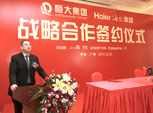 12月30日,恒大集团、海尔集团战略合作签约仪式在广州举行,双方在材料设备提供、装饰工程施工、金融服务支持等三大领域达成战略合作。集团董事局副主席、总裁夏海钧博士,海尔集团轮值总裁、董事局副主席周云杰出席签约仪式并致辞。
