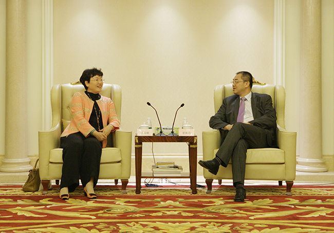 夏海钧总裁(右)与大连大商集团总裁王志敏(左)亲切交流
